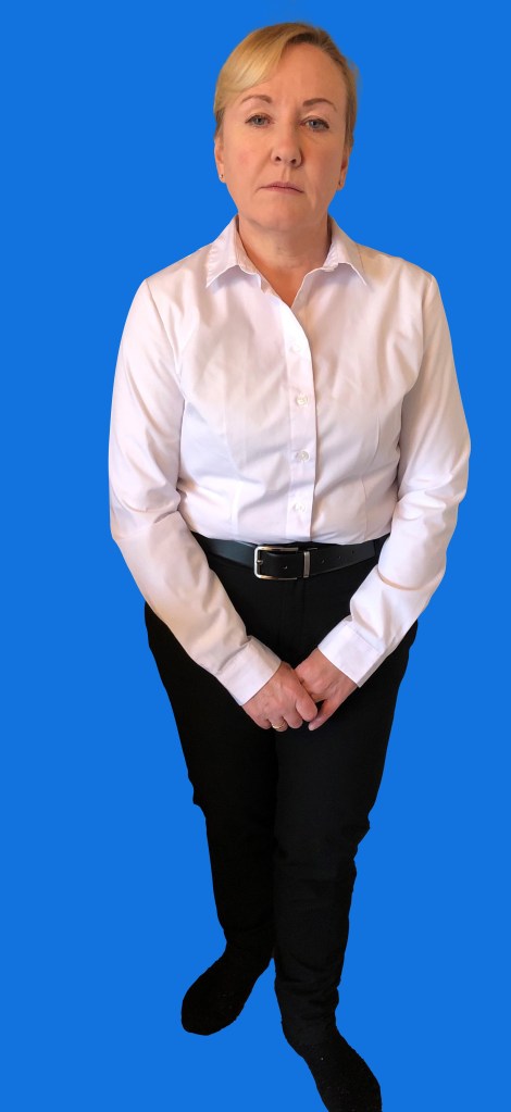 Here I am in my trusty jacket, which I love looking suitably corporate. This is an Autograph jacket from M and S and was a charity shop bargain that cost me £5, as I often have to provide costumes for roles I spend a lot of time looking for good quality clothes in charity shops.